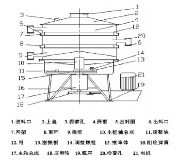 基本的回轉(zhuǎn)運動與人工篩分相類似。偏心率從25到40mm可調(diào),低速V型皮帶驅(qū)動從120到360rpm可調(diào)。每一種產(chǎn)品的停留時間可以通過搖擺篩的徑向與切角朝驅(qū)動軸線方向進行調(diào)整。因此建立水平與拋擲三維翻滾運動。物料從中心到外援在整個篩分過程。水平與垂直加速度隨著粒子的運動而增加,接近篩孔尺寸的顆粒隨之成功分離,較大顆粒被運送到出口處,出口處由一個可調(diào)節(jié)的導(dǎo)向裝置控制流量中,該導(dǎo)向裝置是控制物料停留時間的另一個因素,此次過程在沒篩層之間重復(fù)進行。